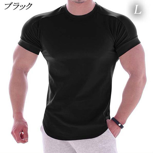 【L/ブラック】 ●【光沢 ストレッチ 素材 Tシャツ】メンズ トレーニング ウエア